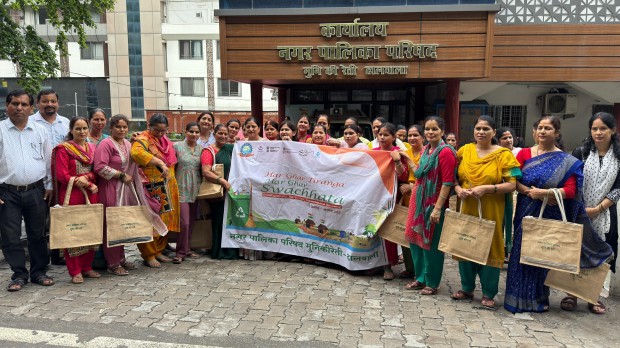 कार्यक्रम के दौरान स्वयं सहायता समूह की महिलाओं ने हस्त निर्मित 2000 कपड़े के थैले पालिका को घरों में वितरित करने को सौंपे।