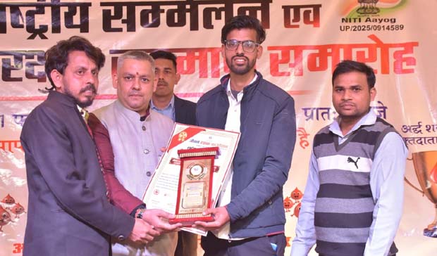 गाजीपुर उत्तर प्रदेश में आयोजित कार्यक्रम में मुख्य अतिथि अभिनव सिन्हा, विशिष्ट अतिथि डॉ. टी.पी. सिंह और फाउंडेशन के संस्थापक शीर्ष दीप ने रोहित बिजल्वाण को नवाजा।