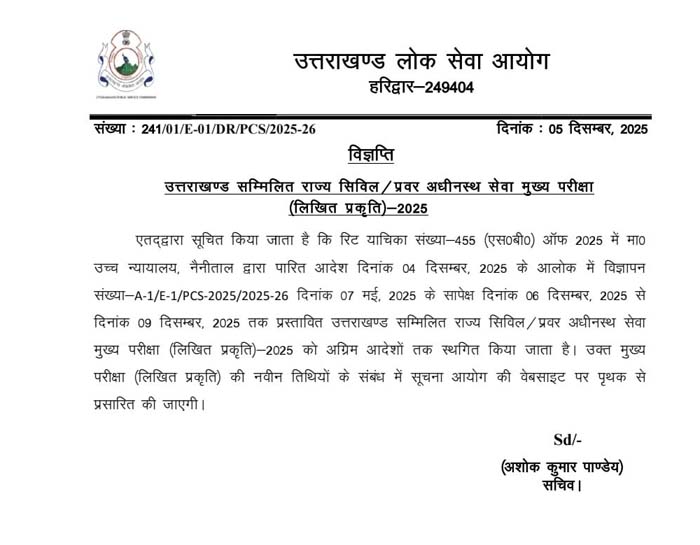 देहरादूनः उत्तराखण्ड लोक सेवा आयोग ने आगामी उत्तराखंड सम्मिलित राज्य सिविल/प्रवर अधीनस्थ सेवा मुख्य परीक्षा (लिखित) 2025 को फिलहाल स्थगित कर दिया है।