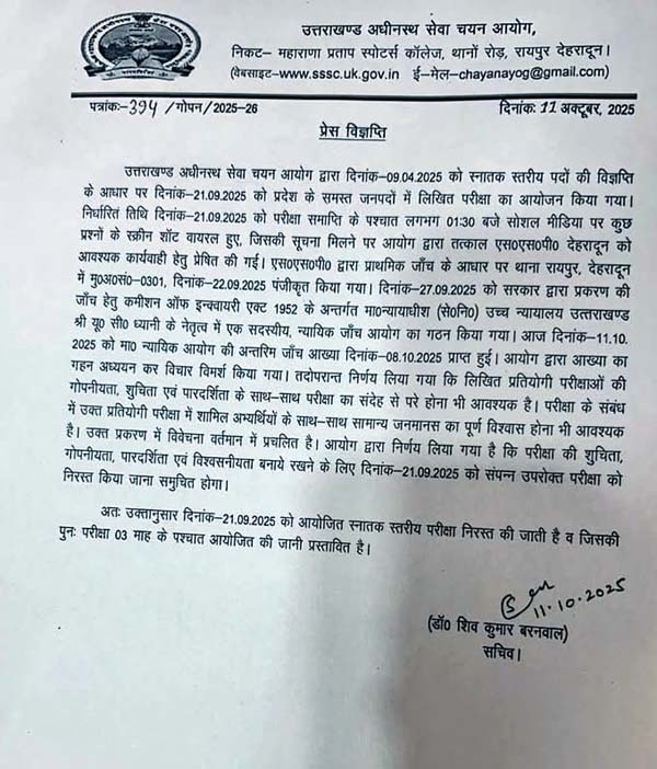 आयोग सचिव डॉ. शिव कुमार बरनवाल द्वारा जारी आधिकारिक विज्ञप्ति में बताया गया कि परीक्षा समाप्ति के बाद सोशल मीडिया पर प्रश्नपत्रों के स्क्रीनशॉट वायरल होने की सूचना मिली थी। इस पर आयोग ने तुरंत एसएसपी देहरादून को जांच के निर्देश दिए, जिसके बाद थाना रायपुर में मुकदमा दर्ज किया गया।